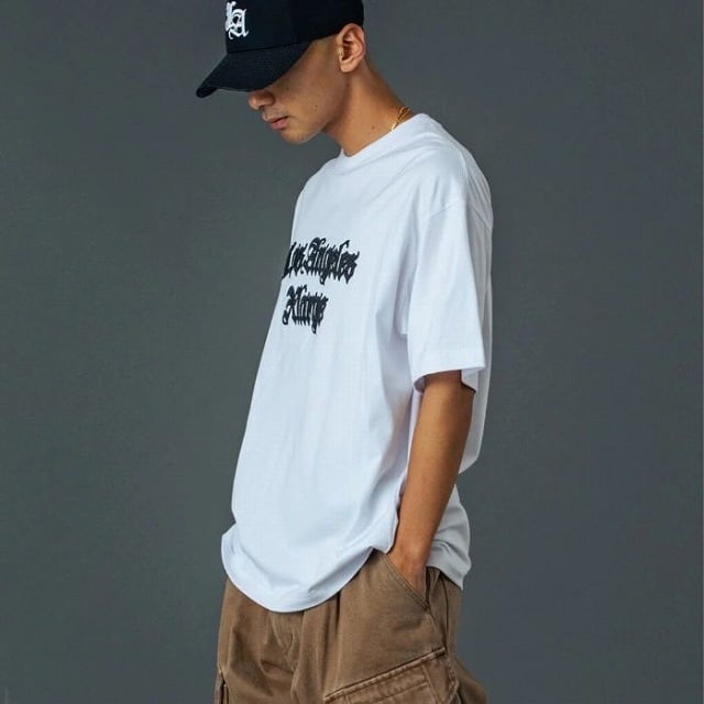 OLD ENGLISH調のロゴをフロントに施した半袖Tシャツ